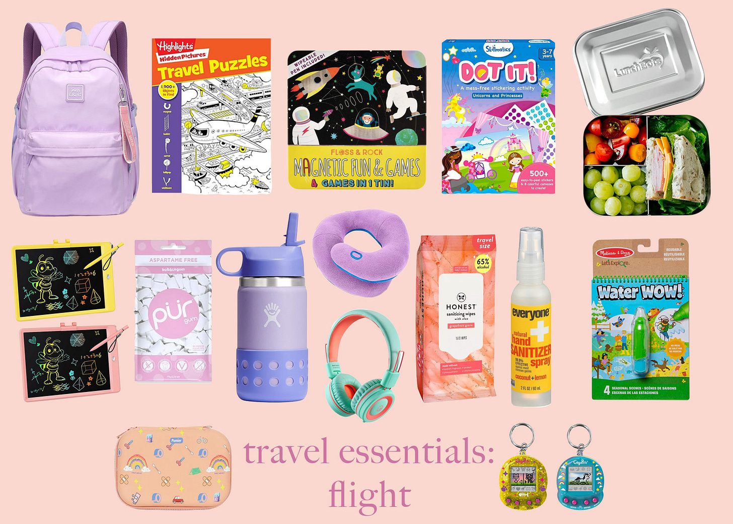 backpack. travel puzzles. magnetic game tin. dot it. lunch container. water wow. natural hand sanitizer. natural sanitizing wipes. kiddie neck pillow. kids headphones. water bottle. gum. drawing board. first aid kit. tamagotchi.